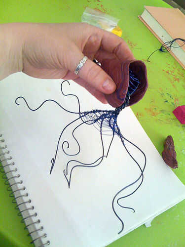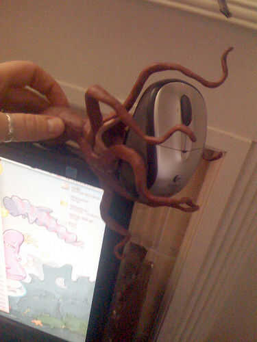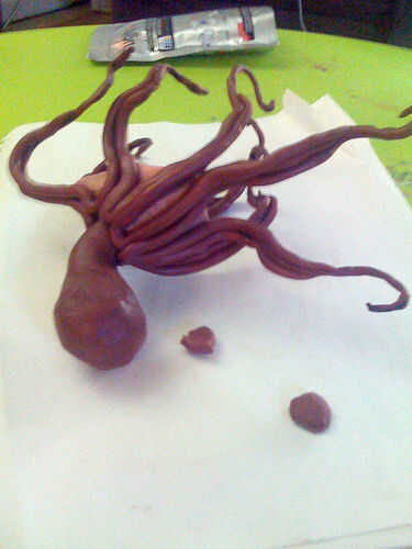 Rodillo hacia fuera ocho serpientes más y presione a lo largo de los tentáculos cerca del cuerpo para hacerlas más gruesas. Tendrás los tentáculos para afilar suavemente hacia las puntas de los tentáculos. Sostener la arcilla pulpo cubierto en lugar para asegurarse de que aún encaja correctamente.