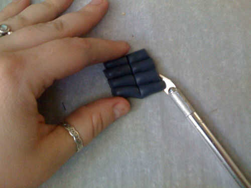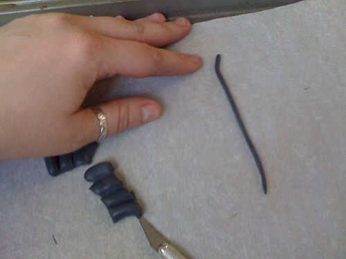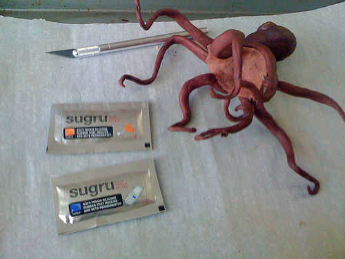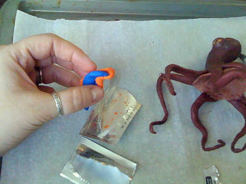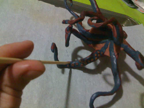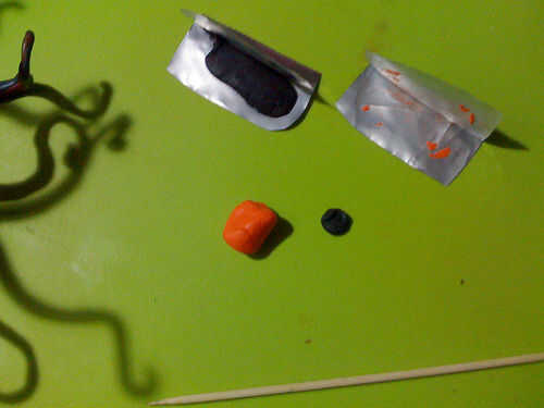 Usé aproximadamente 1/3 paquete de negro con 1 sobrecito de Sugru naranja para las ventosas. Homogeneizar, rodar en una serpiente muy delgada y comienza a cortar pequeños pedacitos diminutos. Los pedacitos del rodillo en bolas y péguelos al azar en Sugru alineado debajo de los tentáculos. Tomar una brocheta de madera y empuje suavemente el extremo puntiagudo en la bola para formar una marca y fijar más firmemente que el tentáculo.