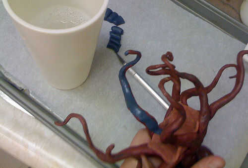 El Sugru es importante agarrar adecuadamente el ratón. Primero, elige uno o dos colores para la parte inferior de los tentáculos. Mezclé naranja y azul para esto, un paquete de cada uno. Sugru mixto del rodillo en una serpiente, luego cortar en ocho partes iguales. Rodillo cada porción en una serpiente larga fina y coloque cuidadosamente a lo largo de la parte inferior de cada tentáculo del centro de pulpo a la punta del tentáculo. Conseguir una taza de agua y jabón. Sumergir los dedos en él. Alise cada serpiente delgada de Sugru en los tentáculos, presionando para que se pegue a la arcilla del polímero al horno. Se pegue a la arcilla, pero le gusta pegarse a los dedos aún más. El agua jabonosa ayudará mucho. Cuando la parte inferior de su tentáculo es completamente lisa y cubierta a su gusto, considere el color de Sugru para las ventosas.