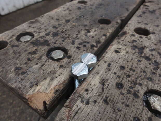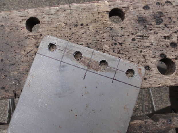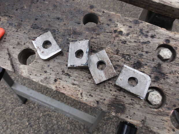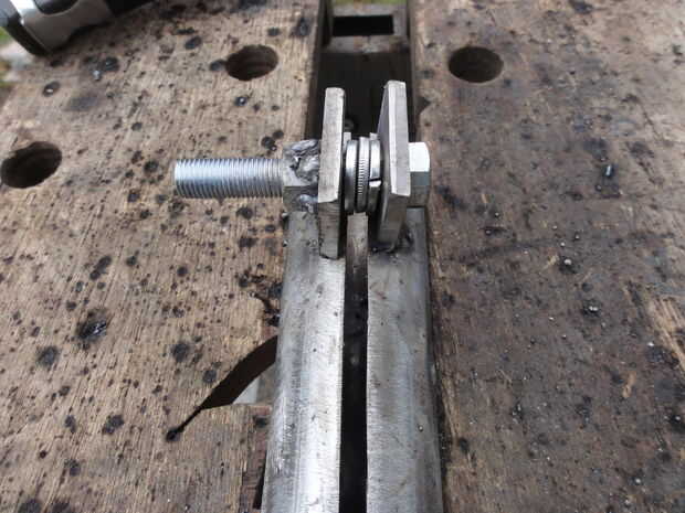 Establecidos (4) lengüetas pequeñas en un trozo de placa de acero y agujeros de perforado 3/8" en cada ficha, luego cortar las pestañas con la amoladora angular. Las fichas fueron después soldado con autógena en 4" EMT largo, (2) a cada lado. Para hacer esto un poco más fácil, atornillado dos lengüetas con arandelas como espaciador antes de soldar en su lugar, usando los pernos de 3/8"-24. Esto asegura que los agujeros para pernos alinearon. En este momento, yo también había soldado la tuerca en las pestañas. Pongo las tuercas en los lados opuestos de la ranura.