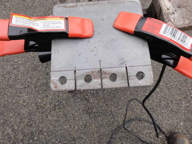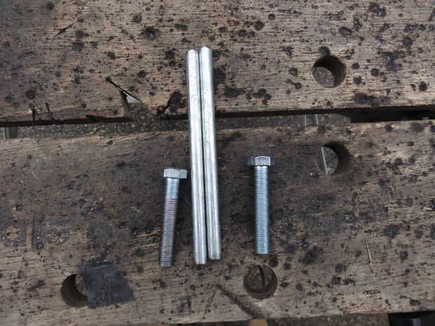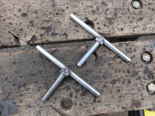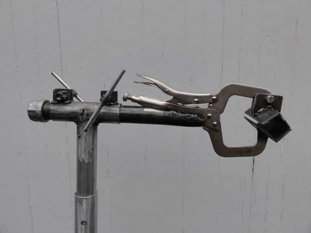 Yo suelo ranuras en la parte superior de dos pernos de grado 5 de 3/8"- 24 x 2", luego corte dos 4" largos de 5/16" varilla de acero y soldada en los pernos para tornillos de la abrazadera en forma de T. Estos tornillos se roscan en las tuercas que se sueldan con autógena en las lengüetas de la abrazadera. He comprado unos 3/8 "x 1" espaciadores largos de acero para que la T-manija se encuentra más allá del lado de la abrazadera del tubo de apoyo.
