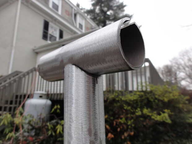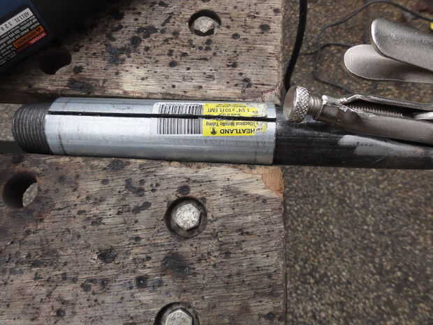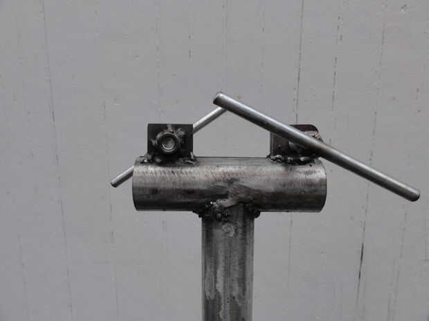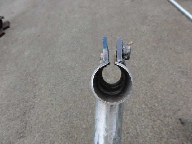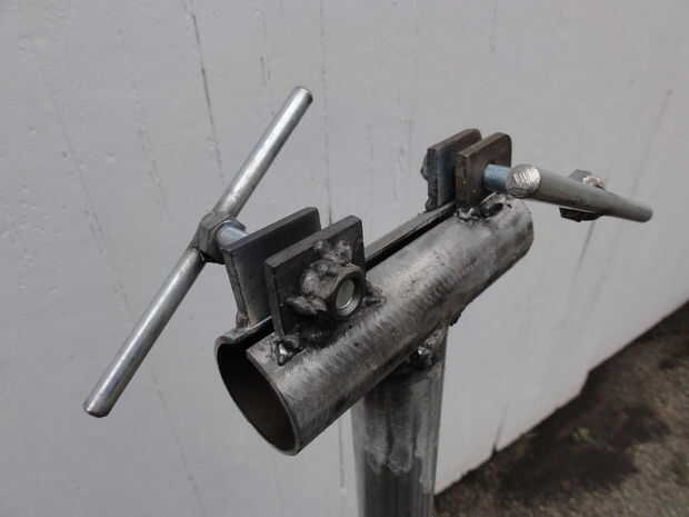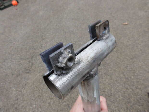 La tubería de acero abrazadera de 1" cabe holgadamente en el EMT de 1 1/4". Yo corte una longitud de 4" de 1 1/4" EMT para sujetar la abrazadera de la tubería. Yo corte una ranura a lo largo de la EMT de 4" de largo con una cuchilla de corte en la amoladora angular y entonces la ranura un poco más amplia. Esta 4" longitud de EMT entonces fue soldada a la parte superior de un +-24" longitud de 1 1/4" EMT publicar. (Nota: la rutina de la galvanización de la EMT en la zona de las soldaduras, antes de la soldadura. No hacerlo puede enfermar!)