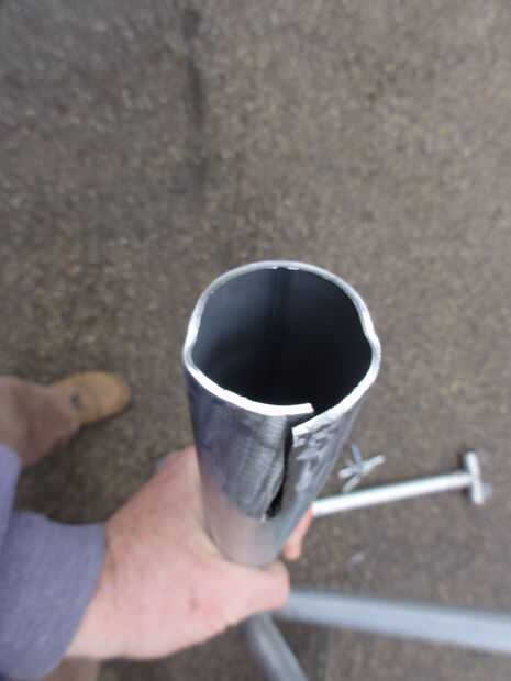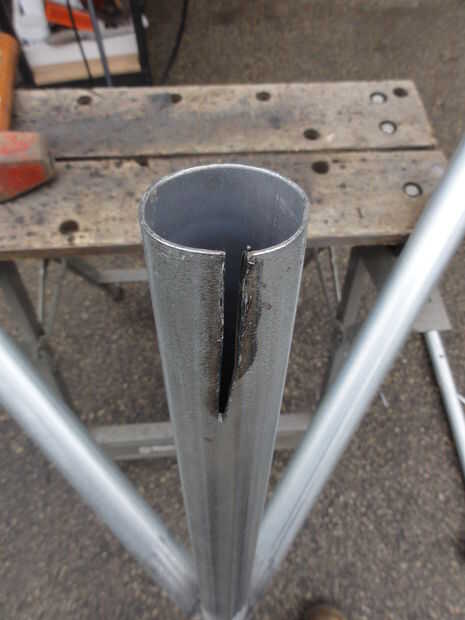 Cortar ranuras en la parte inferior de las dos piernas o el principal puesto de martillado de los extremos de estos tubos para que puedan caber en 1 1/4" PVC casquillos de la pipa que actúan como patas.