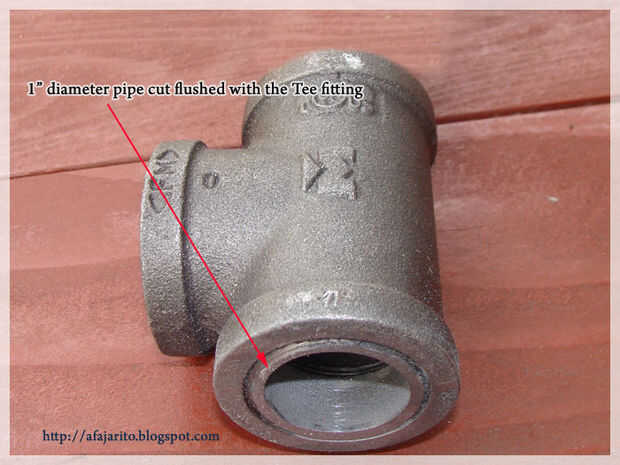 2. usando una sierra de cortar o una sierra para metales, Sierra del tubo a rosca de 1" para que sea integrada en la conexión en t (fotografía abajo). Guardar el tubo extra, necesitarás esto más adelante.