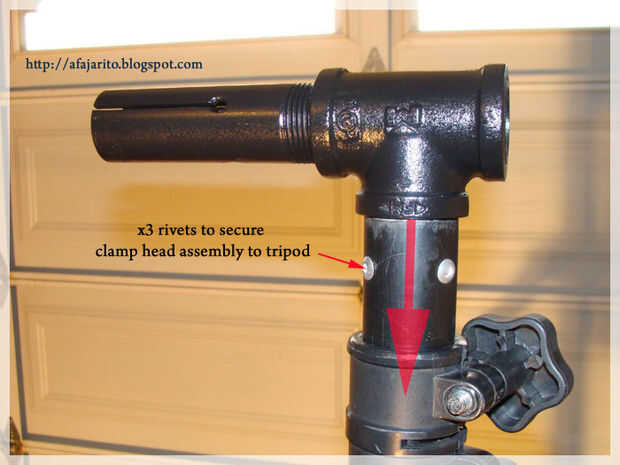 6. rosca otra tubería de diámetro 1" cerca de 6 pulgadas de largo en la parte inferior de la Tee galvanizada de 1". Había pintado negro para estética, entonces usa 3 remaches para fijar el cabezal de la abrazadera para trípode (fotografiado abajo).