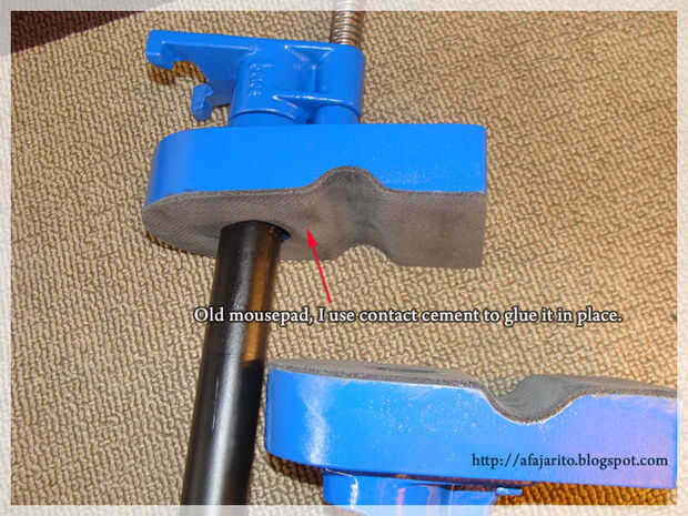 7. ahora para las almohadillas de fijación del bloque de madera, atornillados a la abrazadera de pony y pintado azul (fregadero contrario la cabeza de los tornillos). Una vez seca la pintura, pegué (con cemento de contacto) un viejo cojín de ratón de goma en las secciones cóncavas para actuar como un acolchado de goma.