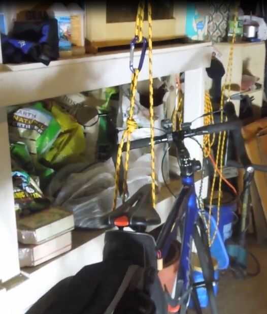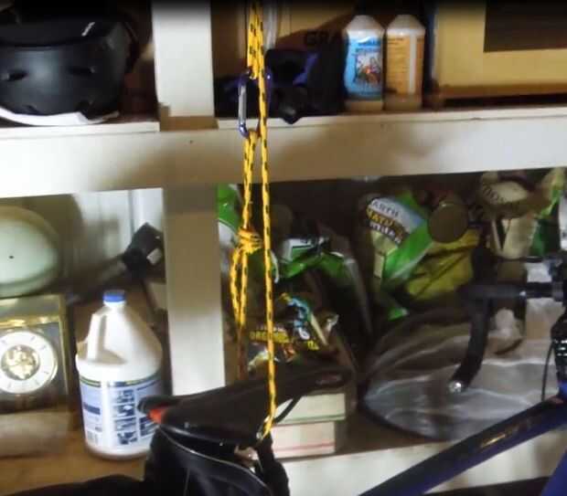 Obtener cierta cuerda y un uno de los ganchos de mosquetón de aluminio barato. Atar a una viga superior o viga. Abrigo debajo del asiento y levante la rueda trasera es para arriba de la tierra unas pulgadas. Atar un lazo en la cuerda para que cuando el clip Levante la moto del suelo.