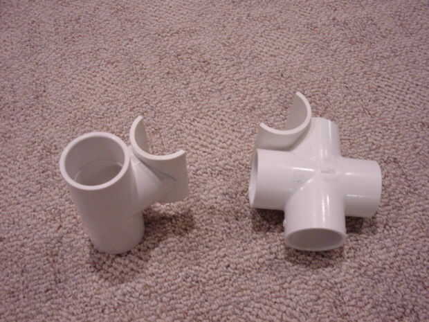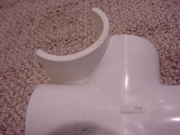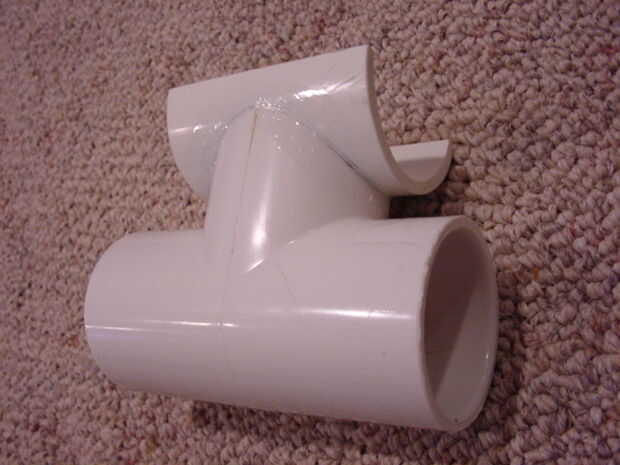 Inicio talla uno de los accesorios de T para que el 2" half-pipe puede ser cementado paralelo lo. Que desea empezar a tallar la rama de la T que corre perpendicular a las otras dos. Desea que los puntos bajos en esa rama a estar apuntando hacia el recto-a través de ramas por lo que cuando que el half-pipe de cemento será paralelo a la dirección de directo. Mira las fotos para ver lo que me refiero.