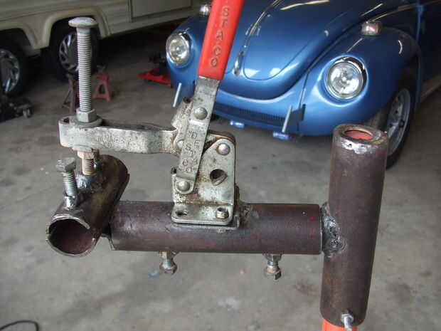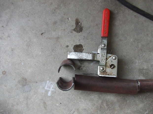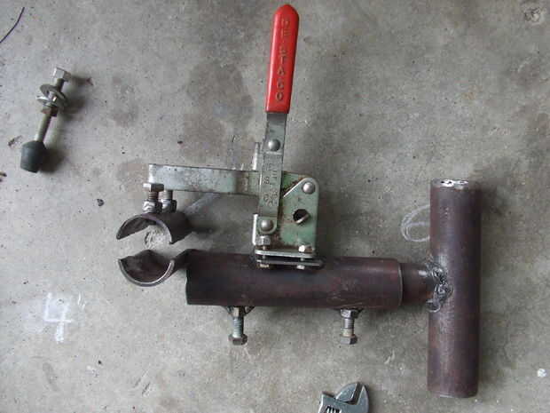 Fueron los soportes de abrazadera que usted tendrá que cortar un trozo de metal plano al tamaño de la base de la abrazadera y soldarlo a la parte superior de esta tubería, puede ver la situación en esta pic. Utilizar la placa en vez de soldar la abrazadera en su lugar lo hará posible cambiar abrazadera si encuentro algo que funcione mejor. Configurar la pinza con 4 tornillos para abrazadera a la placa.