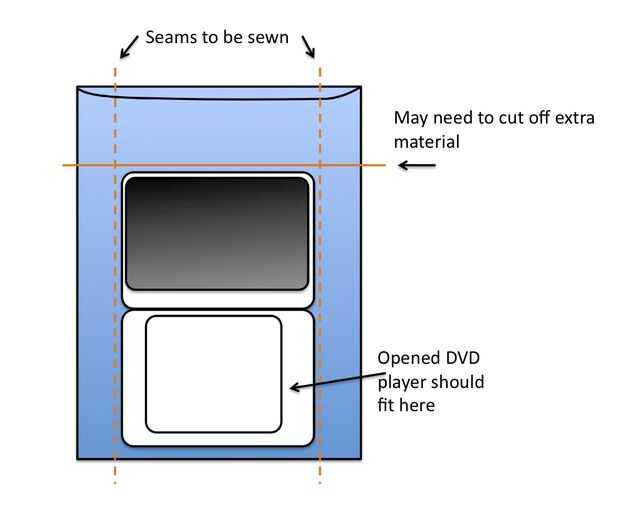 Prender a lo largo de las líneas y luego probar que el DVD todavía encaja dentro de la bolsa ahora más estrecha. No quiere demasiado apretado o será difícil entrar y salir del reproductor de DVD. Sin embargo, no quieres ser demasiado flojo, o el reproductor de DVD se deslice alrededor de demasiado allí. Que tenga que hacer un poco de ensayo y error como el reproductor de DVD tiene un grosor, que afectará donde dibujar las líneas. Para el reproductor de DVD, mis líneas a ser 10 1/4" aparte de la herida.