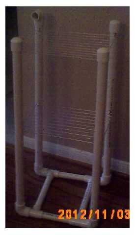 Se trata de una simple pasta secado soporte hecho de unas pocas piezas de PVC, dos parrillas baratas de la tienda de dólar y algunas otras partes. Hay dos niveles. Siempre puede eliminar el nivel inferior si quieres pasta realmente larga. No lo utilice en el piso. En una table.counter o un estante sería mucho mejor.