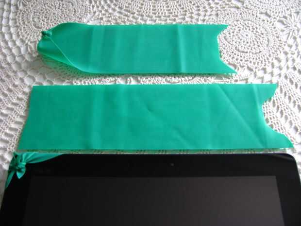 -Corte cortes de 1cm en el centro en ambos extremos de la banda. Las ranuras deben ser paralelas a los bordes cortos y por lo menos 3cm de ellos. La forma más sencilla de hacerlo es doblar la banda por la mitad longitudinalmente y haga una incisión de 0,5 cm en el borde doblado.