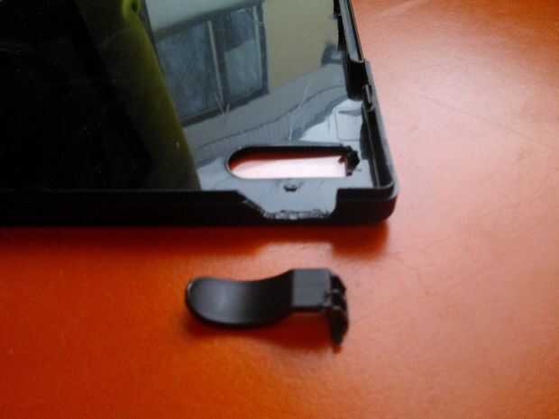 Snap o corte los clips de plástico que sujetan el interior folleto. Cortar la esquina en el borde corta como se muestra. Hacer este paso en ambas esquinas delanteras. Sólo usé un cuchillo para trabajar el plástico, tal vez podría funcionar mejor una sierra para metales pero no tengo uno.