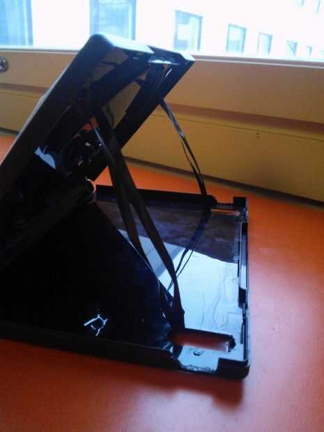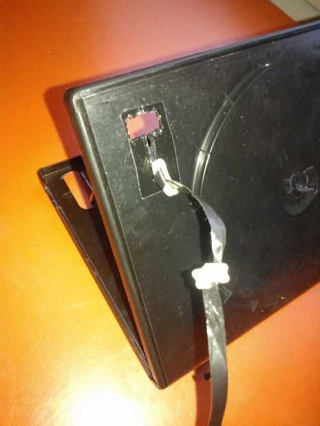 Con su tableta en el stand, encontrar los lugares apropiados para sus tapones. He utilizado pedazos de mierda viejo cable de altavoz, unos 20 mm de longitud. Rodó la cinta de regalo uno alrededor de la pieza de cable, entonces utiliza unos alicates para recortar el cable alrededor de la cinta.