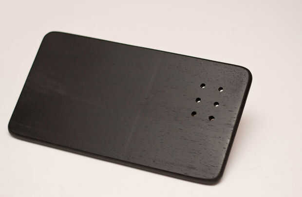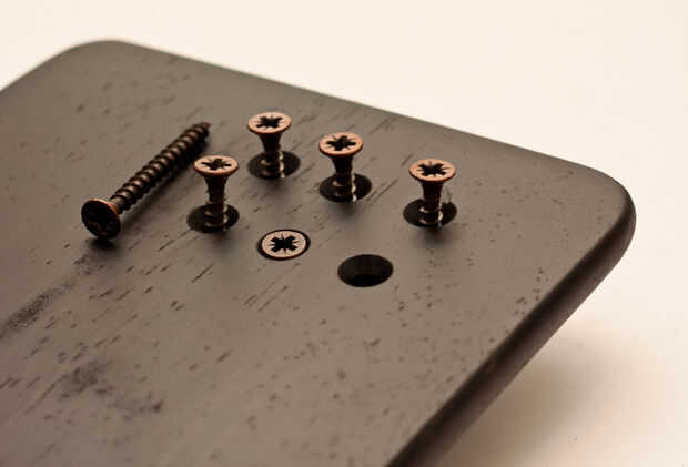 La base está hecha de un pequeño tablero de madera para cortar embutidos, es una buena madera y ya ha redondeado los bordes y dimensiones correctas. He perforado seis agujeros para unir sólidamente la columna. En la superficie inferior de la Junta he perforado con una broca de cono las ranuras para mantener dentro de la cabeza del tornillo.