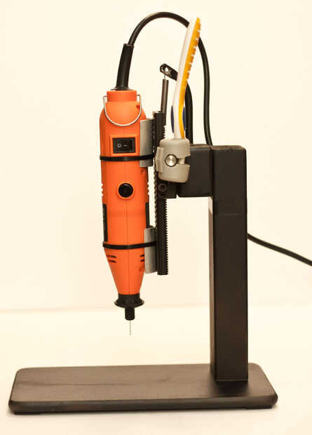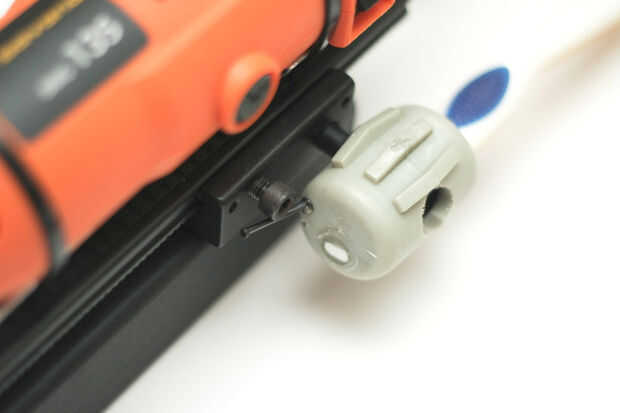 La pieza de plástico gris que ves en la foto ha venido en práctica para mí porque hace exactamente lo que necesitaba, es decir, bloquea juntos dos vigas perpendiculares cilíndricos. Es una pieza de un parabrisas de moto. Pegué el cepillo de dientes para que mantenga estrecha la otra abrazadera la perilla de metal. Si no encuentras un objeto similar puede vincular el cepillo de dientes con una banda de nylon.