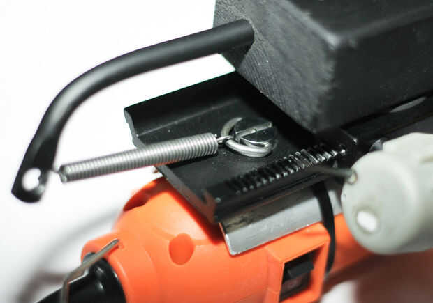 Se puede ver como en la parte superior del tablero de madera he hecho un agujero profundo en el que yo he insertado la barra de aluminio. Usted debe doblar un poco la parte insertada en la madera para evitar que se desliza. Este bar ya tenía el agujero y yo doblada para que su cabeza está en la vertical del eje con el tornillo de carril. Este tornillo, como el otro, ya tiene un asa para ayudar a apretar, y lo he utilizado para unir el extremo inferior del resorte. El otro extremo está bloqueado a la barra.