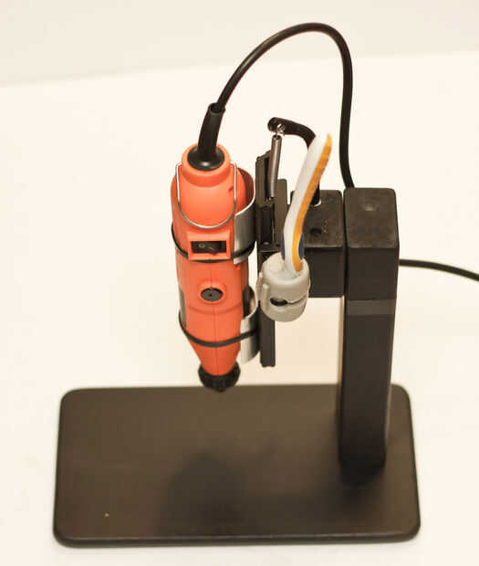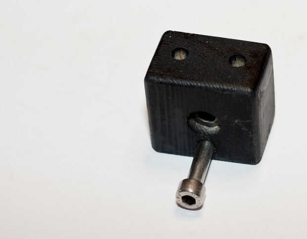 El espaciador es un bloque pintado negro de madera, que está diseñado para poner distancia entre la columna y el carril, por lo que se puede taladrar un pcb más grande. Un agujero horizontal conecta a los ferrocarriles con tornillo de 1/4" y otro agujero tiene una tuerca al final, en este otro tornillo unirá el bloque a la columna. Los dos orificios verticales deben tomar la barra de aluminio.