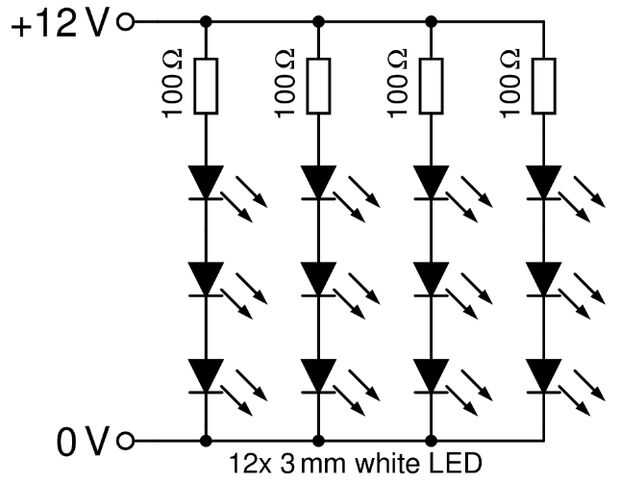 Usando 3mm blanco LEDs funcionando a alrededor de 20mA con una tensión de aproximadamente 3, 2V por LED da te deje el valor de la resistencia limitadora actual como R =(12V-3*3.2V)/20mA o aproximadamente de 100 ohm. Tuve que usar resistencias SMD debido al espacio limitado en el circuito, mientras que eligieron estándar 3 mm LEDs de taladro pasante porque llego a tener un gran stock de estos.