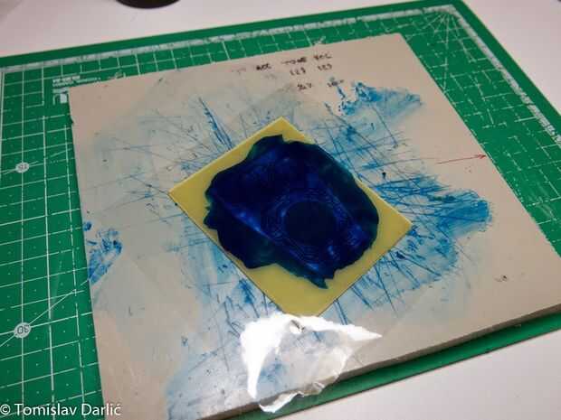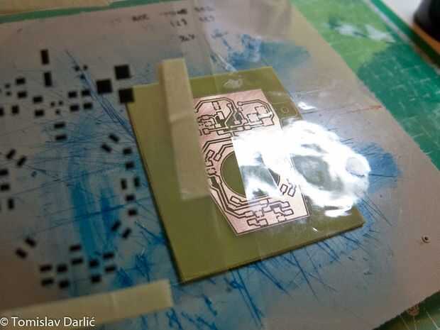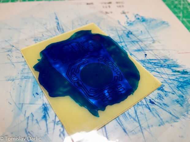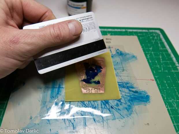 Poner la pequeña cantidad en la cubierta de PCB con celofán (yo usé uno de envoltura de la caja del chocolate). Es importante que el celofán es claro. Difundir con la tarjeta de crédito hasta agradable y uniforme.