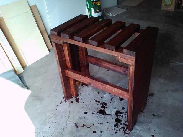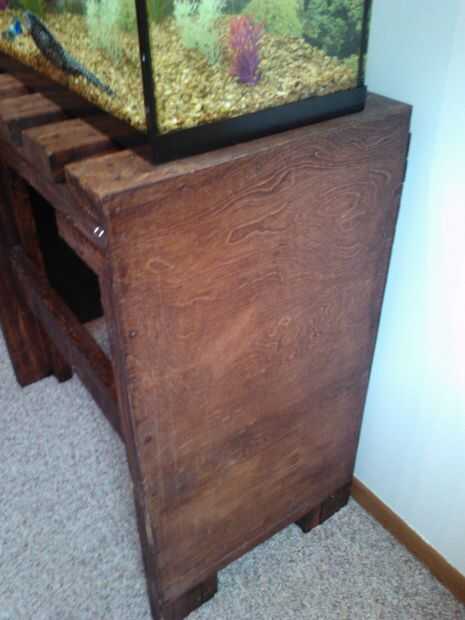1. básicamente tomar el soporte del tanque de peces en el garaje y cargar con tinta para madera. Escoges el color. Aplicar generosamente la mancha y el soporte del tanque de peces será muy oscuro. Menos mancha = acabado más ligero.