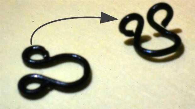 Desde el sistema de cierre de gancho y ojo solo necesitamos el ojete. Doblar las orejas del ojal con el fórceps para que formar 90° de ángulo (ver imagen).