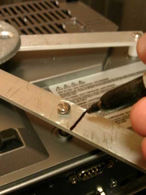 Trace una línea en la tira de aluminio de 1/2" de este tercer agujero. Use la sierra para cortar a lo largo de esta línea.