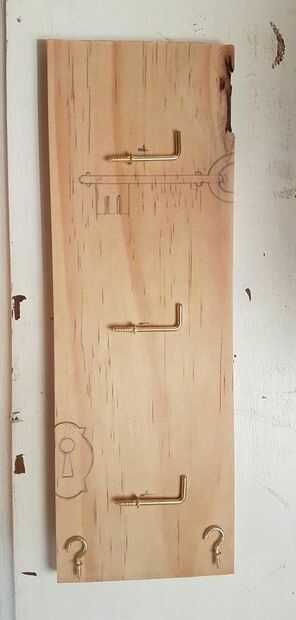 Corte la madera a la medida y plan de lo que usted quiere ir en él. Para éste quería por lo menos 3 buenos ganchos para los titulares de clave principal y un par de pequeños para esas teclas sueltas que son necesarios alrededor de la casa.