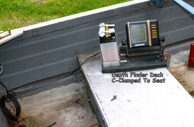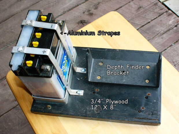 Tome el soporte que viene con el buscador de profundidad para sostener la cabeza de la unidad y la batería. Colocar sobre la pieza de madera contrachapada y marcar su ubicación. No ponga la batería en el borde de la madera contrachapada como Ud. va a necesitar y pulgadas o menos para montar la barra plana de aluminio para asegurar la batería. Medir la distancia alrededor de la batería (los cuatro lados) y su ángulo de aluminio de corte al que longitud. Ahora tienes que doblar el ángulo de aluminio en un rectángulo de alrededor de la batería. Usted tendrá a muesca hacia fuera el ángulo de aluminio en cada esquina para formar el rectángulo. Una vez que ha hecho esta prueba colocar la batería para un ajuste preciso, pero no hermético. Una vez que estés satisfecho con el ajuste, perfore agujeros en la parte inferior del ángulo de aluminio y fijarlo a la madera contrachapada con tornillos para madera. Asegure el soporte de cabeza también.