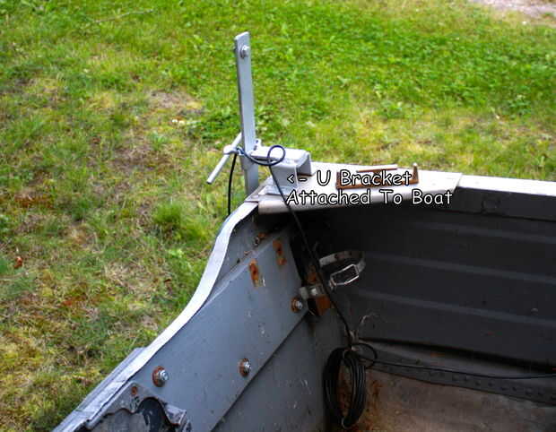 Medir la parte de atrás de su barco desde la parte superior hacia abajo en la esquina trasera. Corte piso aproximadamente 6" más de su medida. Perfore un agujero en la parte superior de la parte plana de la barra donde pones en una tuerca, perno y las arandelas. Esta tuerca y el tornillo actúan como una parada de seguridad. Tome el soporte de tipo U, que se emperna a la parte posterior de la embarcación. Marca esto y taladre dos orificios para montar el soporte, pero no lo monte el soporte. Una vez que la ubicación del soporte U, mida la distancia desde la parte delantera del soporte U a la parte posterior de la embarcación para que tenga aproximadamente una pulgada de espacio libre más allá de la parte posterior del barco. Con esta medida, corte dos trozos de barra plana. Estas dos piezas serán soldadas a la parte superior y la parte inferior de la parte superior del soporte U. Una vez que vea las fotos quedará más claro.