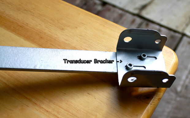 En la parte inferior de la cañería de la barra plana, Monte el soporte del transductor, el vino con el buscador de profundidad. Un par de agujeros de taladro y asegure el soporte. La pieza está ahora completa y listo para montar en su barco. Perno del soporte U a su barco y listo. Ahora eres capaz de aflojar la tuerca de mariposa y mover el plano de la barra para arriba y fuera del camino para evitar dañar el transductor.