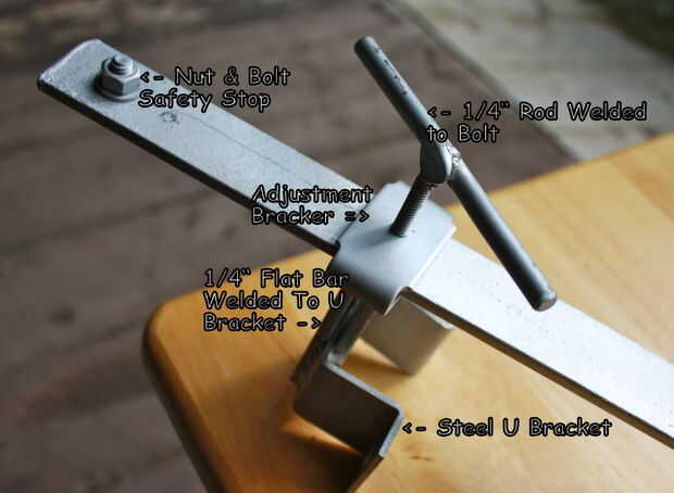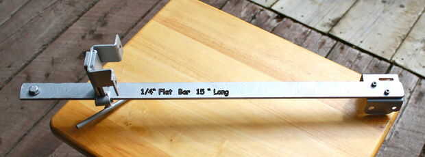 Ahora toma un trozo de barra plana y dóblela alrededor de la pieza principal de la barra plana. Esta pieza debe ir totalmente alrededor de la vivienda principal bar. Sobre la parte plana, taladre un agujero y golpéelo suavemente para que coincida con uno de sus pernos. Esta pieza doblada debe permitir que la pieza principal de murciélago plano Deslice hacia arriba y hacia abajo en su interior. Ver las fotos de aclaración. Ahora toma la pieza de 1/4" redondo stock y soldar esto al perno que vas a utilizar. Esto hará que un tipo de ala grande del perno para asegurar el piso principal bar.