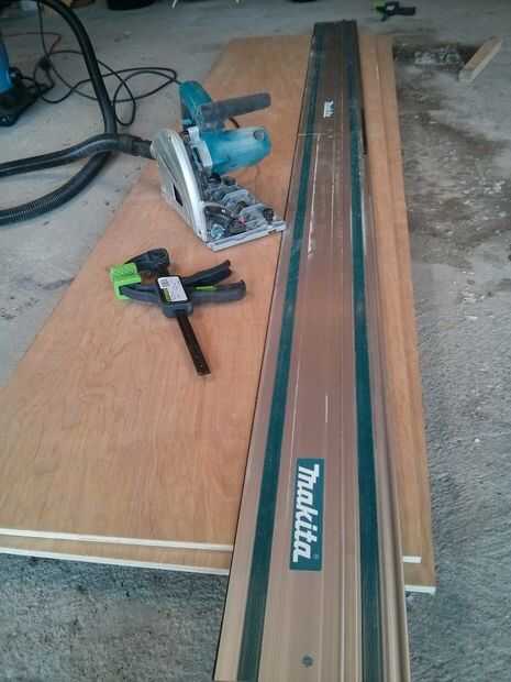 Como un regalo de Navidad a mí mismo me compré una sierra Makita paso circular y un carril de guía. Es la mejor herramienta para dividir grandes hojas de madera contrachapada u otro material de madera en mi opinión. De esta manera la hoja puede poner plana en el suelo sobre algunos paneles finos. Por supuesto podría dividir la hoja con cualquier tipo de sierra, pero una sierra con un carril de guía hace el limón peasy fácil trabajo squeezy.