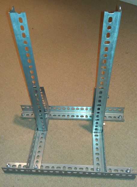 Reduce al mínimo costo y residuos mediante el diseño de un stand de estructura simple pero eficaz usando un solo 10' pedazo de barra de ángulo de acero (con o sin agujeros) y catorce ¾" longitud, ½" pernos, arandelas y tuercas. Las herramientas que necesarias fueron un lápiz, medición de cinta, Sierra de arco, una llave y un trinquete (hará dos llaves). Si usted decide usar la barra de ángulo de acero sin orificios, necesita un taladro y broca metal así.