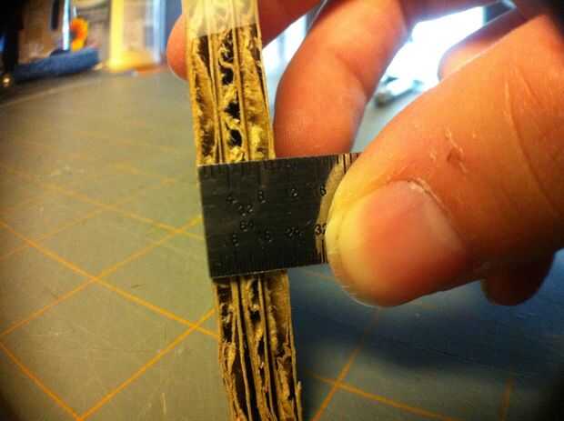 3 pila de las piezas y medir el espesor de la pila.  En la foto, el grosor de mi pila de cartón es 5/16 de pulgada.