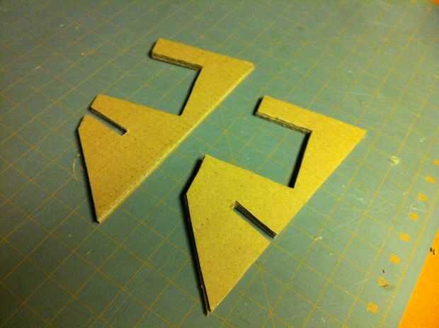 Tres de sus piezas tendrá una ranura que va desde la parte superior de la base hasta la mitad y los otros tres tendrán ranura que va desde la parte inferior de la base hasta la mitad.  Yo he marcado el punto medio de la línea central de la plantilla se puede utilizar para escala.