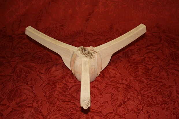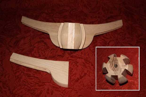 El escudo 6 y termina fueron cortado de la acción plana de madera, utilizando sólo la X Y en una plantilla que permite a las partes a ser volteadas con precisión y tienen el mismo corte curvo compuesto como el primer lado. (El éxito de esta plantilla es los puntos de control. Cuando redacté mi diseño en Autocad me centré la; diseño dentro de un rectángulo de 4 orificios (punto). Así que cuando voltee madera stock final de final en la cama del CnC, solo tengo que voltear el archivo de Autocad, para sacar las coordenadas de un revés del corte. Los brazos eran simples pegadas en la sección de centro y los extremos estaban pegados y atornillados por lo tanto es el botón en la parte frontal para ocultar el tornillo. Me volví el plato de sombrero en un torno estándar, hay también un botón ocultar el extremo de la varilla de la SS.
