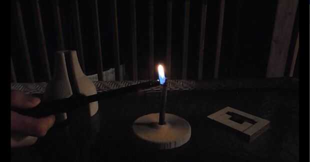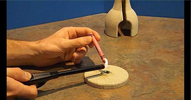 2.) Mantenga el encendedor en la parte inferior de la tiza hasta la cera que se pega hacia fuera comienza a derretir un poco. Presione este lado en el soporte por lo que se asegura en el agujero. Mantenga la tiza en lugar por unos segundos mientras la cera se endurezca nuevamente. Esto se ve en las imágenes 1 y 2. Asegúrese de que no hay ningún polvo de lechada en el agujero para que la cera se adhiere al soporte.