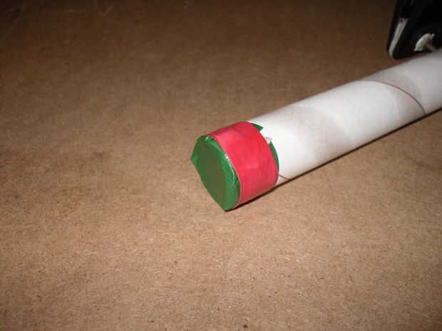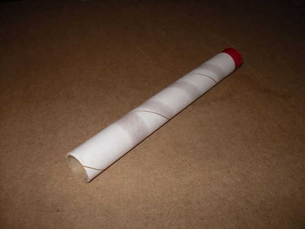 Conseguir el tubo de vacío y poner un palillo de tambor en él, usted tendrá que tener suficiente del palillo de la muestra para poder agarrar cómodamente y no olvidar que también se necesita un enchufe en la parte inferior para evitar que caiga. Corte de tubo interior, lo suficiente como para rodar para arriba y conecte la parte inferior cinta adhesiva cerrado.