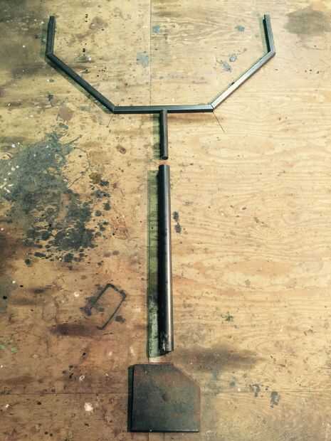 Para los dos extremos de la horquilla, perfore un agujero a través perpendicular al ángulo del corte a inglete. Hice mis agujeros 1/2" de la parte superior de la horquilla. El acero es más fácil de conseguir a través de si usted hace un piloto de 1/8" agujero primero y luego el orificio de 3/8". Elegir el tamaño según el tamaño de la varilla roscada se pondrá en el espejo. A veces utilizo barra de 1/2", a veces 1/4", dependiendo del tamaño y peso del espejo. Luego usé la amoladora para cortar el metal por encima de los agujeros para que los ejes del espejo pueden ser bajados en la ranura.