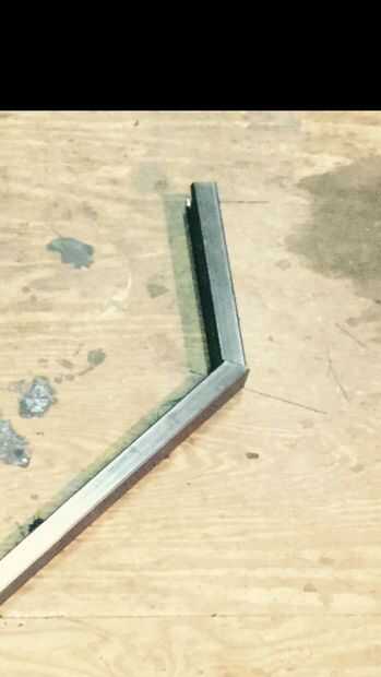 Para mantener incluso el espacio entre el espejo y la estructura, puse un pedazo de 1" cuadrado stock a lo largo del borde del espejo y mi plantilla de papel se utiliza para marcar el metal según las líneas de sharpie que dibujé en el piso.