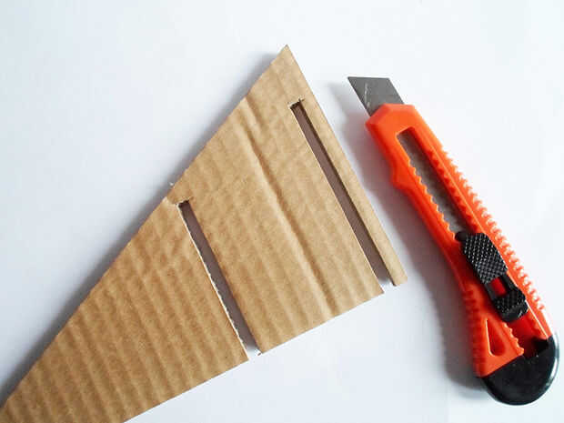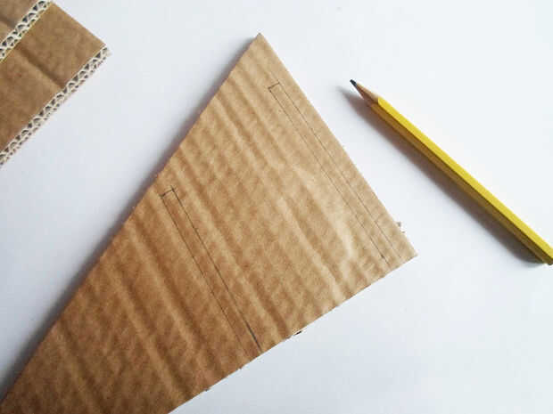 Dibujar un 10cm (3,93 '') alto tira que es tan gruesa como el grueso de la cartulina, a aproximadamente 1cm desde el lado corto de los triángulos. Mi cartón es de 0,6 cm de espesor para la tira que hice es 10 x 0,6 cm.