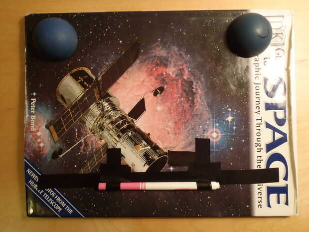 Con la cinta aislante, fije el marcador en el lugar aproximadamente una pulgada por encima del fondo del libro. (ver foto)