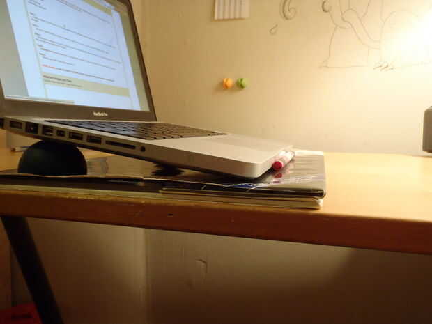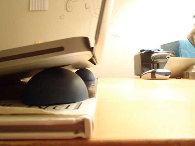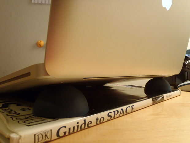 Coloque las dos mitades de la pelota de una pulgada de la parte superior del libro. Asegúrese de que ellos están uniformemente espaciados. Coloque su computadora portátil en la parte superior y ajuste el balonmanos si es necesario.