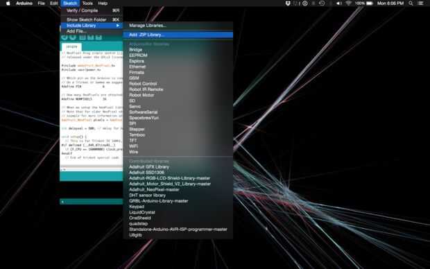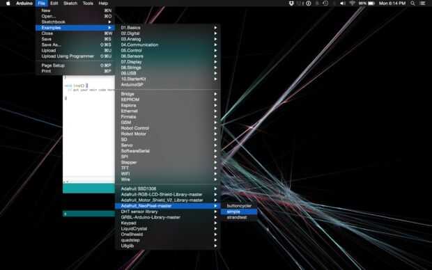 Descargar el archivo del zip de la biblioteca de Adafruit Neopixel abajo. Para instalar la biblioteca, abrir el ide de arduino. Ir a dibujo -> incluir Biblioteca -> Biblioteca añadir ZIP... y seleccione la biblioteca que ha descargado. Ahora carga el bosquejo "simple" desde archivo -> ejemplos -> Adafruit_NeoPixel - master - > simple a tu arduino. Eso es todo!