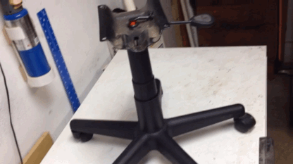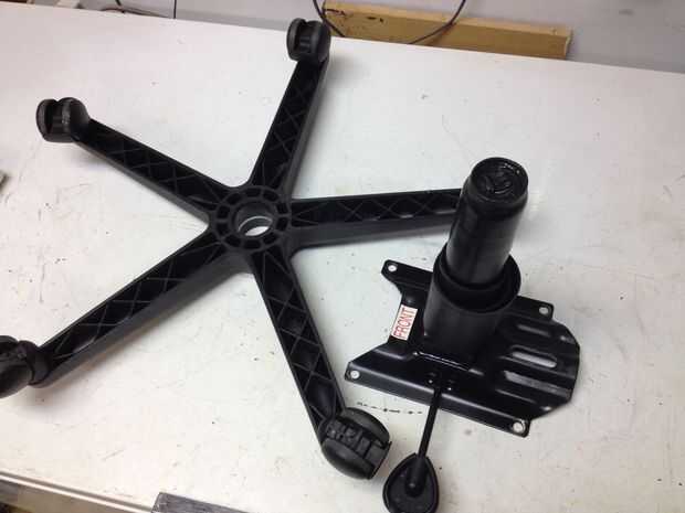 Nota: Ya que esta era originalmente una silla, la plataforma que el asiento se hace para tener un peralte posterior inclinada (ej.: la parte posterior de la silla se sienta ligeramente más baja que la parte delantera). Debido a esto, cuando todo es al revés, el cilindro de elevación no es perfectamente vertical. Si tuviera que hacerlo, de primer nivel y montar la parte superior como se muestra en el siguiente paso y después volver a este paso para completar la modificación de la altura.