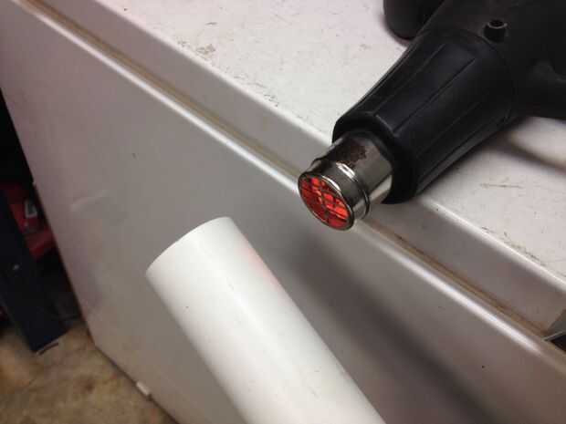 El PVC es aproximadamente el mismo diámetro externo que el cilindro de elevación, pero el PVC es fácil de dar nueva forma una vez que esté caliente. Utilicé una pistola de calor, pero se pueden lograr los mismos resultados con un soplete de propano, fogata, parrilla de la barbacoa, etc. la gran preocupación no está el PVC caliente lo suficiente como para quemar o liberar gases tóxicos. Probablemente el método más seguro es sumergir el extremo en agua hirviendo hasta que alcance una temperatura que sea suave y flexible.