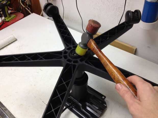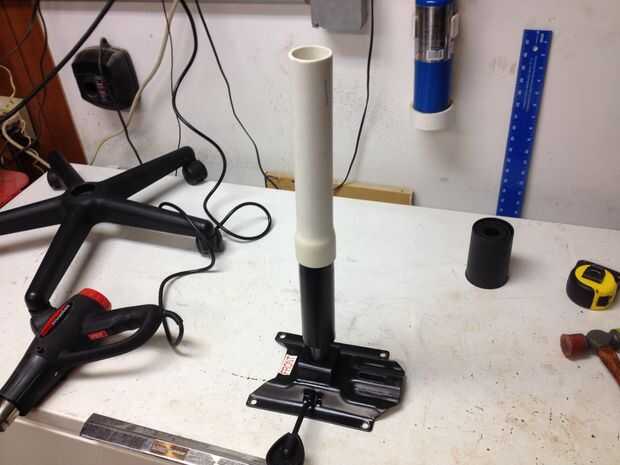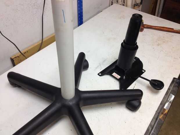 El cilindro de elevación de la silla se encajan en la base con ruedas. Se puede quitar fácilmente con un golpe de un martillo de plástico. Una vez retirado el cilindro de elevación, puede ver que la parte inferior del cilindro es cónico para proporcionar un calce en la base. Buscando alrededor de mi garaje, encontré un pedazo corto de 1-1/2" Schedule 40 PVC que bastante Acomódesela en la base. Con el seco de PVC en la base, tomé la base y el cilindro de elevación detrás en el sofá para determinar cuánta altura necesitaba añadir. Terminé de cortar el PVC a 11-1/2".