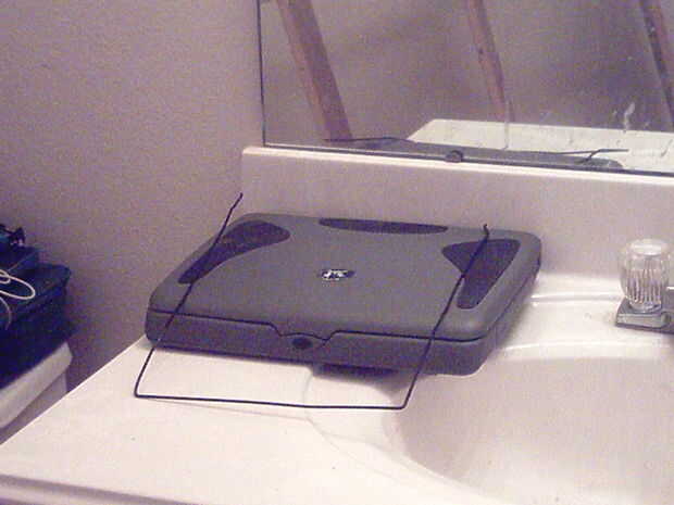 Un soporte del ordenador portátil con aire refrigerado por ventilaciónPrimero comprar un stand de supermercado que tiene metal marco con uno o dos mazos de cable.Se necesita un pañuelo como un remojo para enfriar la ventilación.Un recipiente para agu