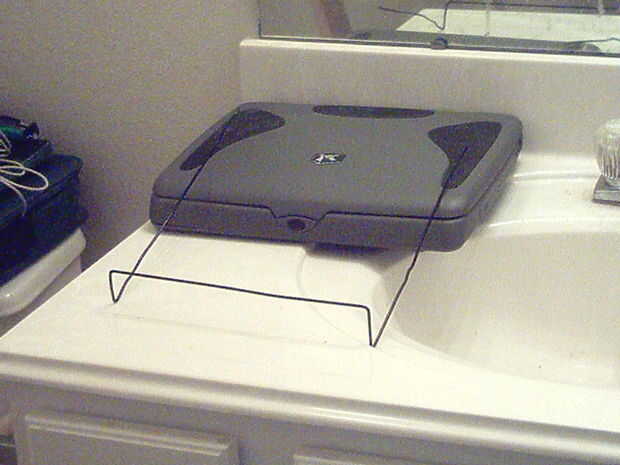 Un soporte del ordenador portátil con aire refrigerado por ventilaciónPrimero comprar un stand de supermercado que tiene metal marco con uno o dos mazos de cable.Se necesita un pañuelo como un remojo para enfriar la ventilación.Un recipiente para agu